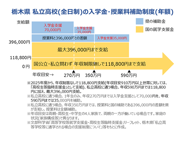 年収目安270万円未満世帯は70,000円、年収目安270万円以上590万円未満世帯は35,000円が入学金から減免されます。また、授業料の支援として、年収目安350万円未満世帯で授業料と就学支援金の差額が補助されます。詳細な条件などは、栃木県のWebサイトでご確認ください。