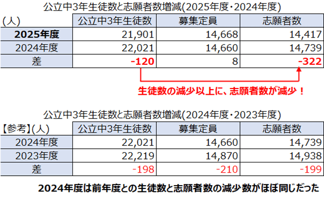 公立高校受検者の母体となる公立中学3年の生徒数は、前年度と比べて120人の減少ですが、公立高校志願者はその減少数はそれを上回る322人。その結果、いわゆる"定員割れ"という状況になりました。