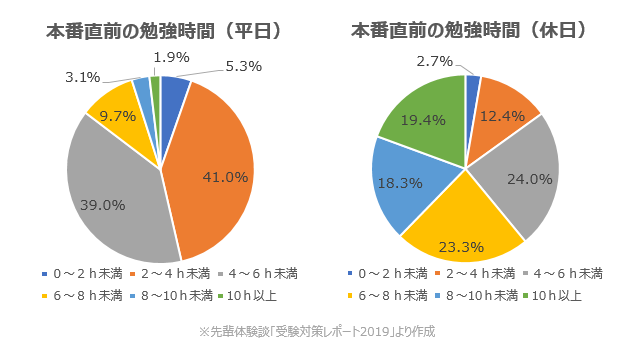 先輩たちの入試直前の平均勉強時間は、平日でも4.4時間、休日は6.8時間(グラフ参照)と長時間です。