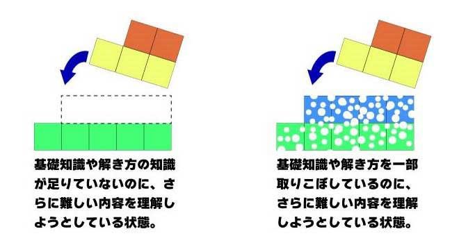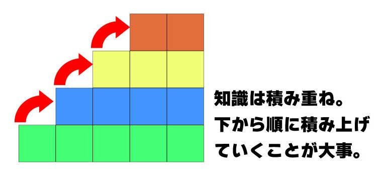 これは、土台となる基礎が不十分だから起こることなんだ。基礎知識や考え方は、一つひとつ下から順番に積み上げていかなければならない。イメージにするとこんな感じ。