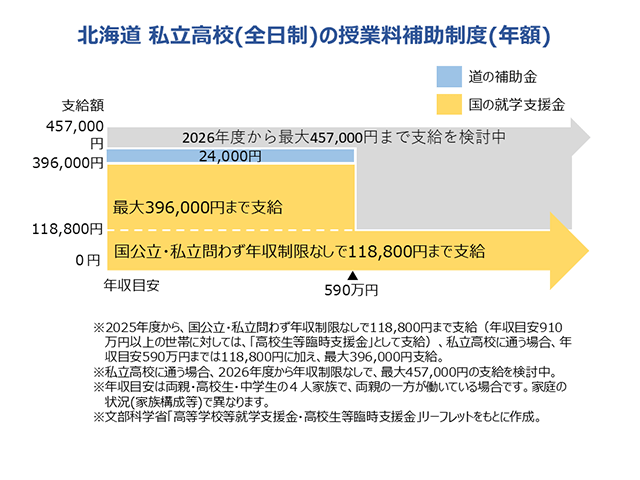 北海道では、北海道内の私立全日制高校に在学の場合、年収目安590万円未満の世帯に対して、独自の「授業料軽減補助金」を上乗せします。