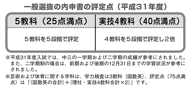 | - | - | 5教科×5段階評定 + 実技4教科×5段階評定 ×2倍 |