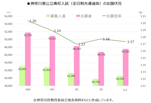 2022年度入試で実質倍率が高かった高校(全日制普通科)は、学力向上進学重点校の指定を受けている横浜翠嵐高校をはじめ、多摩高校、横浜緑ケ丘高校、鎌倉高校、希望ケ丘高校、茅ケ崎北陵高校、横浜平沼高校といったエントリー校など、大学進学指導に特に力を入れている高校が多くなっています。