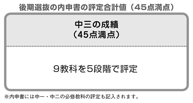 調査書(内申書)には中一~中三の成績が9教科5段階で記入されますが、後期選抜の合否判定で使用するのは、中三の調査書の評定合計値(内申点)(45点満点)です。