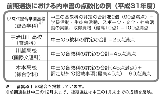 | 川越高校 (国際探究科) | 中三の9教科×5段階評定=45点満点 |