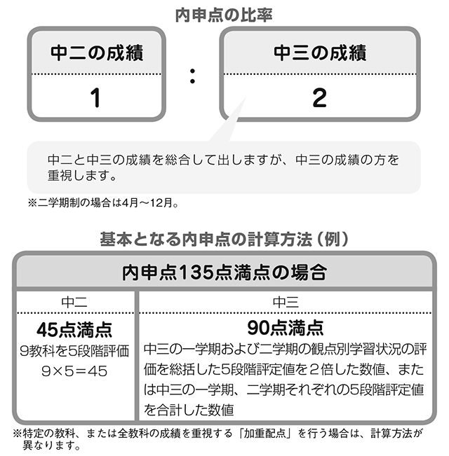 ※特定の教科、または全教科の成績を重視する「加重配点」や、「特技に関する記録〔体育〕」の得点を加算する場合は、計算方法が異なります。