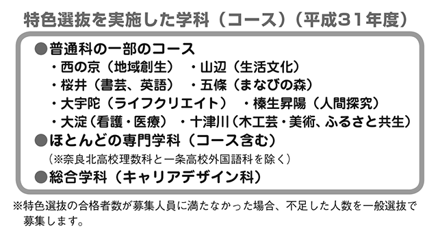 | 選抜方法 | ・調査書(内申書)成績、検査成績を合計し、合計点の高い人から合格。調査書のその他の記載事項も選抜の資料となる ・「調査書の特別な取扱い」で選抜する高校がある ※「調査書の特別な取扱い」…募集人員の中から各高校が合格人数を定めて、調査書のその他の記載事項の中から重視する事項を点数化し、「各教科の学習成績」に加算して行う選抜 |