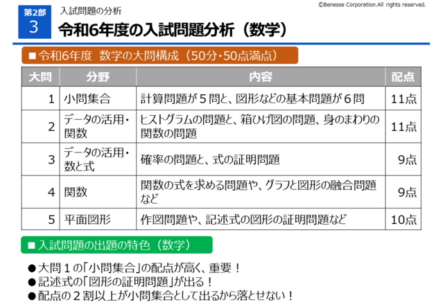 数学の問題でポイントになるのは、基本問題の配点が高いということ。基本問題を短時間で正しく解けるようになることがまずいちばん重要になります。