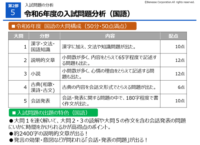 また、大問5問のうち、長文読解が3問も出題されます。入試では、さまざまなテーマ・タイプの文章が出されますので、ふだんから、多種多様な長文をたくさん読み、長文に慣れておくことがポイントとなります。