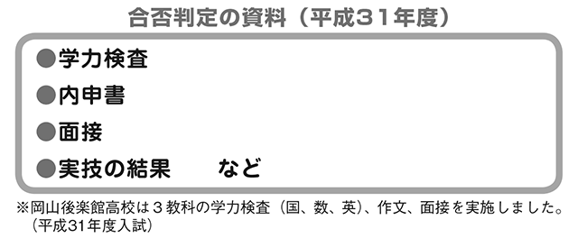 一般入学者選抜はほとんどの高校・学科・コースで実施します。選考は、5教科の学力検査と調査書(内申書)、面接、実技の結果などを総合的に判断して行います。その際、調査書(内申書)の「学習の記録」に記載された評定から求めた換算点(内申点)と学力検査の合計得点を、それぞれ10段階または5段階に評価したもので相関表を作成し判定の資料とします。また、募集定員の一部について学力検査の結果が一定以上の場合、調査書(内申書)・面接などを重視して選抜する高校・学科・コースもあります。2026年度(令和8年度)は、岡山朝日高校が国語・数学・英語(聞き取り検査含む)を自校作成問題で実施します。