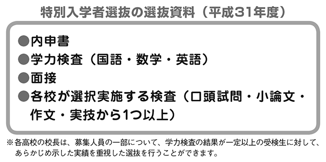 特別入学者選抜は、専門学科、総合学科、一部の普通科で実施します。募集定員に対する募集人員は、専門学科、総合学科が50~100%の間、普通科のコースが50%以内(※一部例外あり)、一部の普通科(コース等を除く)が30%以内(一部例外あり)です。全員に3教科(国・数・英)の学力検査および面接と、口頭試問・小論文・作文・実技のうち1つ以上を各高校が選び実施します。調査書(内申書)とこれらの検査結果を選考資料とし、目的意識や適性などを重視して総合的に合否を判定します。特別入学者選抜に合格内定した場合、必ず入学することが条件です。合格内定とならなかった場合は改めて一般入学者選抜に出願できます。
