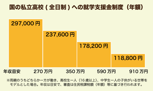 授業料の補助として、生活保護世帯には年額1万9,800円、世帯年収590万円以上610万円未満程度の世帯には年額7万9,200円の補助があります。