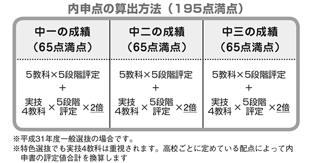 | 5教科×5段階評定+ 実技4教科×5段階評定×2倍 =65点満点 | 5教科×5段階評定+ 実技4教科×5段階評定×2倍 =65点満点 | 5教科×5段階評定+ 実技4教科×5段階評定×2倍 =65点満点 |