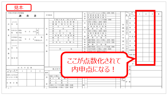 受験生一人ひとりの中学校の成績や学校生活をまとめたものが、調査書(内申書)です。中学校の先生が作成して、志願する高校に提出します。この調査書(内申書)の、おもに各教科の学習の記録の欄に記載される成績(評定)を点数化したものが「内申点」になります。