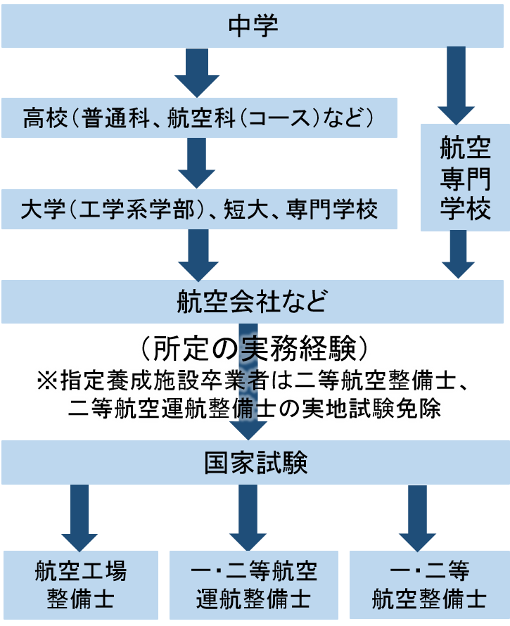 まず、4年制大学の工学系学部や短大、高専、航空専門学校などを卒業し、航空会社などに就職して一定の整備経験をつんだ後、国家試験を受けるのが一般的です。