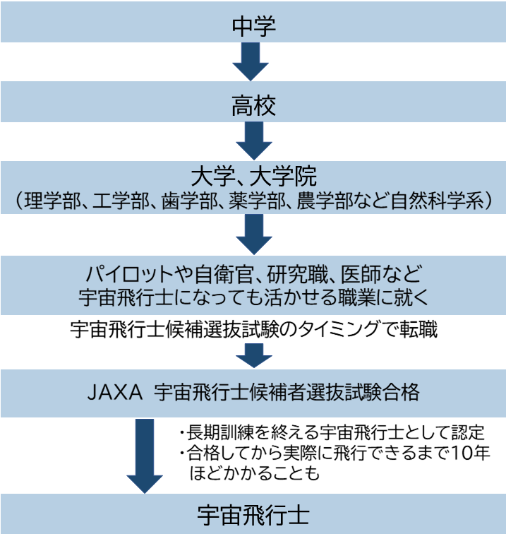 これまで宇宙飛行士に採用された人は、パイロットや自衛官、研究職、医師など宇宙飛行士になっても活かせる職業を経験しています。
