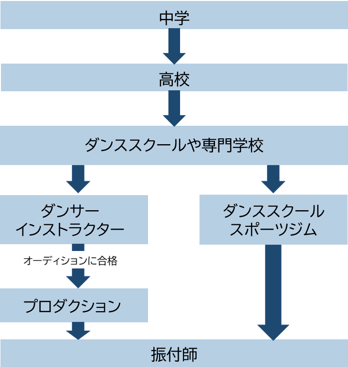 その後、タレントやダンサー、歌手などの振り付けを担当する一流の振付師を目指すには、ダンサーやインストラクターとしての経験を積みながら、振付師を専門に扱うプロダクションのオーディションに合格して、プロダクションに所属するのが一般的です。