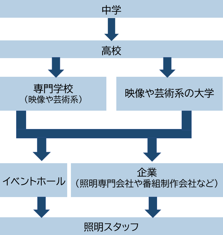 照明の仕事は専門性が高いので、現場でアシスタント的な仕事を担当しながら徐々に大きな仕事を任せられるようになることが多いようです。