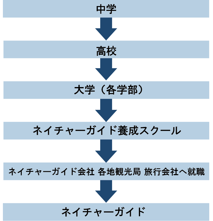 ネイチャーガイドになる一般的(いっぱんてき)な方法は、まずネイチャーガイドの養成スクールなどで知識やスキル身につけて、ネイチャーガイド会社や各地の観光局、旅行会社の採用試験を受けてネイチャーガイドになるルートがあります。