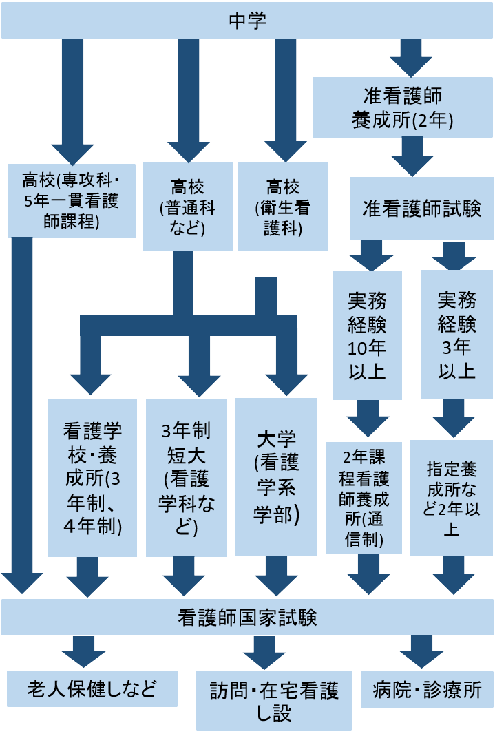 受験資格はさまざまな方法で得ることができますが、基本的には大学や三年制短大、三年制専門学校(看護学校)などで看護の専門教育を受けるのが一般的(いっぱんてき)です。