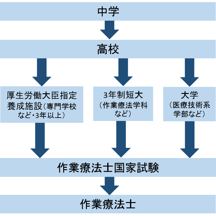 受験するには、作業療法学科など養成課程のある4年制の大学や短大、文部科学大臣が指定した学校、または都道府県知事が指定した作業療法士養成施設で3年以上、必要な知識と技能を得ることが必要です。