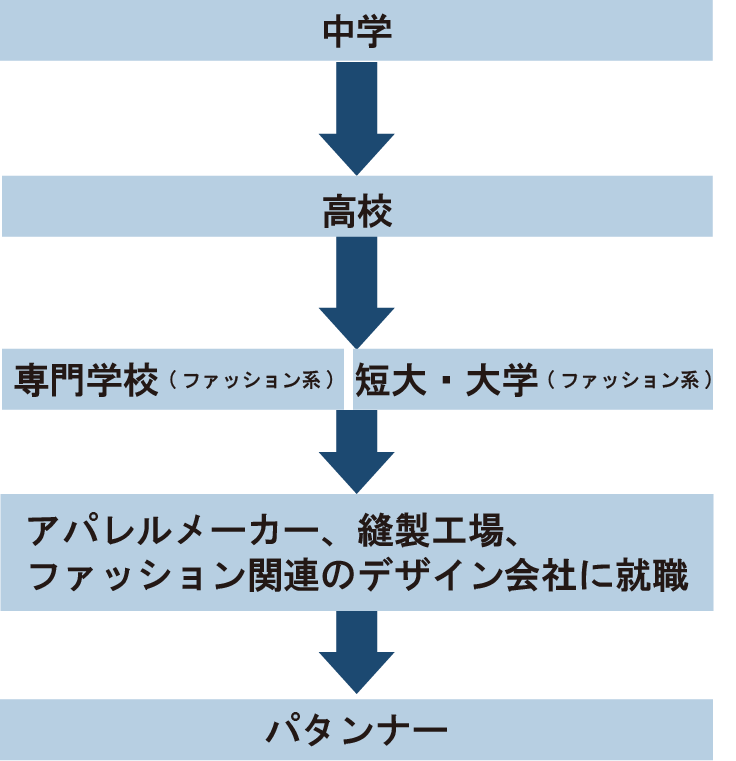 パタンナーになるには、ファッション系の専門学校や大学・短大などに通ってパターンについての基礎技術を学んだ後、業界に入るのが一般的なルートです。