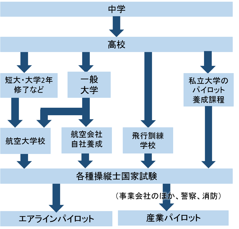 旅客機を操縦するパイロットになるには、航空会社の自社養成パイロットに訓練生として採用されるコースと、航空大学校やパイロット養成課程のある私立大学、または民間の飛行訓練学校などでライセンスを取得した後、卒業して航空会社に入社するコース等があります。
