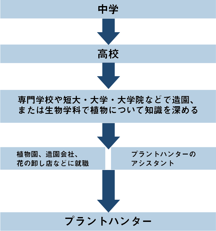 卒業後は、植物園、造園会社、花の卸し店などに就職して植物についての知識を深めて独立するか、プラントハンターのアシスタントとして働いて仕事を学んでいく方法が考えられます。