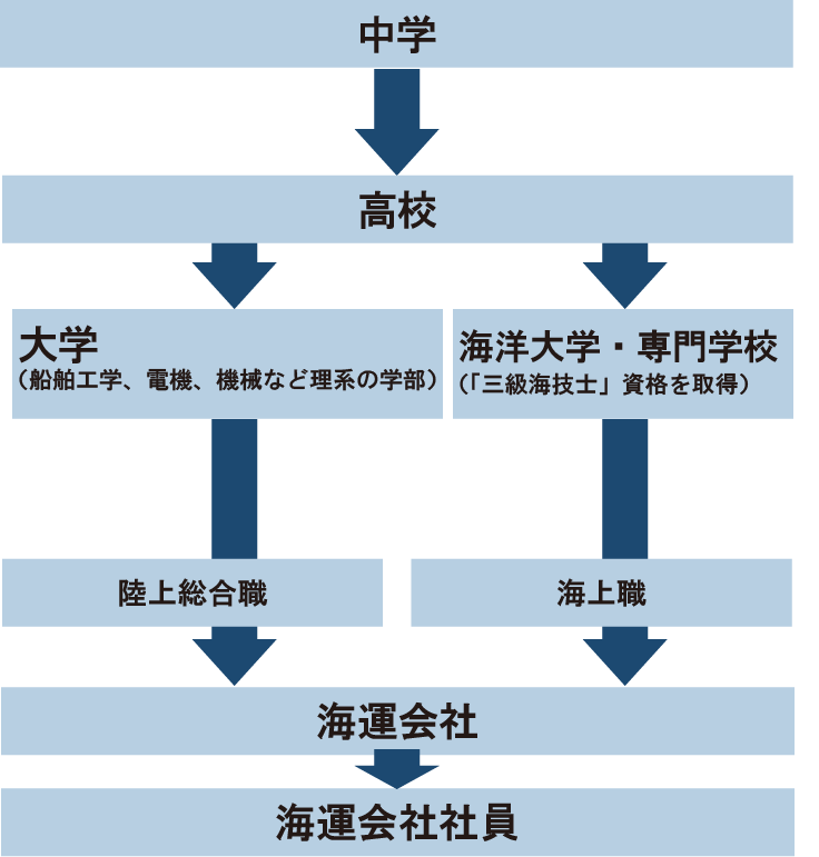 また「海上職」の募集では、社内で航海士や機関士を養成する会社以外は、海洋大学や専門学校で「三級海技士」資格を取得した人が採用条件になります。