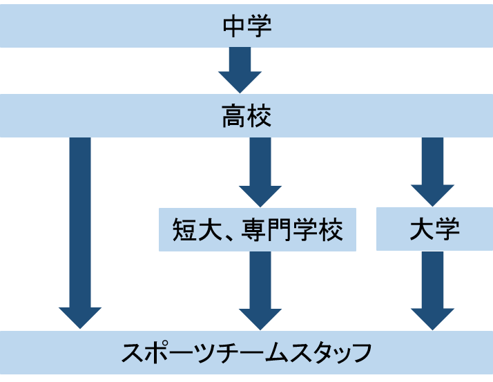 スポーツ関連の専門学校などでは「スポーツビジネスコース」といった名称で、チームスタッフを目指す人材の養成を行っているところもあります。