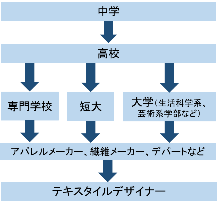 テキスタイルデザイナーになるために特別な資格は必要ありませんが、専門の知識や技術が必要なので、芸術系大学の染織関連の学科やデザイン学科、4年制大学や短大の生活科学系学部、専門学校のテキスタイルデザイン科などで基礎を学ぶのが一般的なコースです。