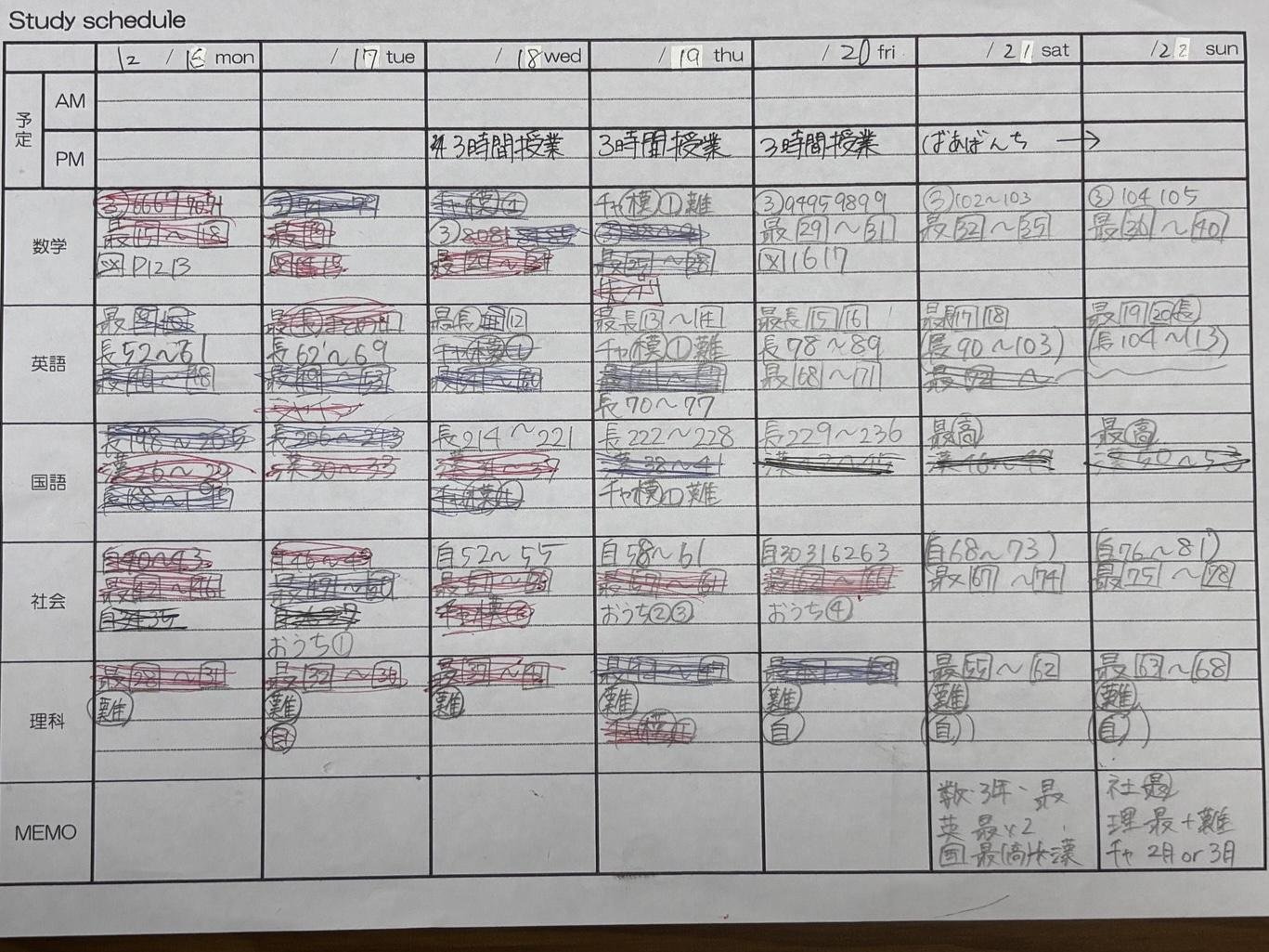 夏休み明けの2学期も「ゼミ」教材を中心に勉強して、ニガテを発見したら補強するというスタイルは変えませんでした。ただ、2学期は学校行事が多いので、平日は疲れて勉強に身が入らなかったり、寝てしまうことも。そこで1週間分の計画を立て、平日にできなかった勉強を土日で消化するよう工夫をしました。私のように計画を立てるタイプの人は、余裕をもったスケジュールを立てておくとよいと思います
