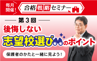 内申点の目標とともに、そろそろ決めておきたいのが志望校。現在の高校は、さまざまな制度や学科、特色ある教育など多彩な学びが可能になり、行きたい高校を絞りきれていないお子さまも少なくありません。そんなときは、受験のプロが講師を務める「合格戦略セミナー」にぜひご参加ください。5月24日(土)は、「志望校選び」をテーマに、高校の基礎知識や高校選びの方法をくわしく解説します。