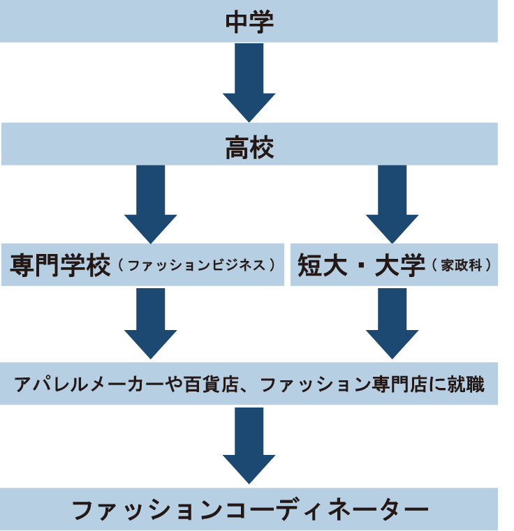 ファッションコーディネーターになるルートは、高校を卒業後、大学や短大の家政科か、ファッション系専門学校でファッションビジネスやスタイリストについて学んでおくと就職に有利になるでしょう。