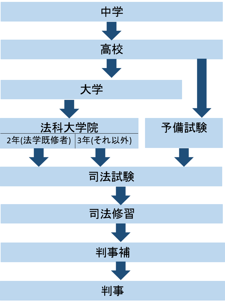 司法試験に合格後、司法研修所で学び、さらに司法修習の最終試験(司法修習生考試)に合格、裁判所が行う面接を受けると裁判官(はじめは判事補(ほ))になれます。