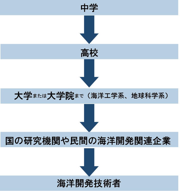 大学で海洋工学系、地球科学系の学問を学び、もしくは関連する大学院まで進学して専門性を深めた後、国の研究機関や民間の海洋開発関連企業に就職するのが一般的なコースです。