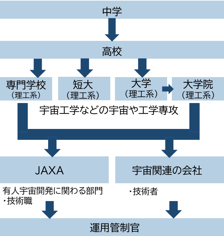 現在、日本で運用管制官になるためには宇宙航空研究開発機構(JAXA)の有人宇宙開発にかかわる部門に配属されるか、宇宙事業に技術を提供する企業に就職し、技術者として運用管制の仕事につく必要があります。