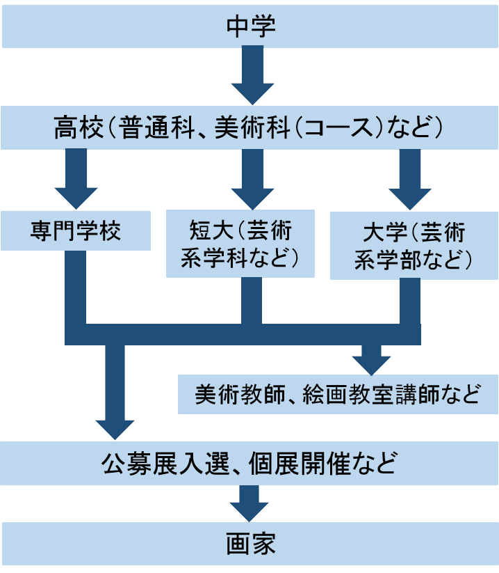 初めから画家で生計を立てるのが難しいことを考えると、美術系の学校を出て、副業として美術関連の仕事につくことから始めるのが現実的です。