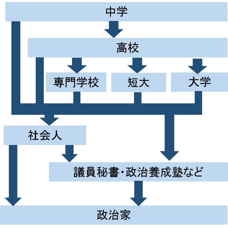 学歴などは問われないので、政治家になる前の職業は、政治家の秘書、弁護士、医師、ジャーナリストなどさまざまです。