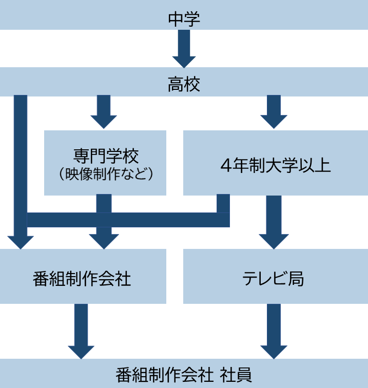 「カメラマン」「編集マン」「照明スタッフ」のような技術職では専門学校で技術を学んだ人が多いようです。