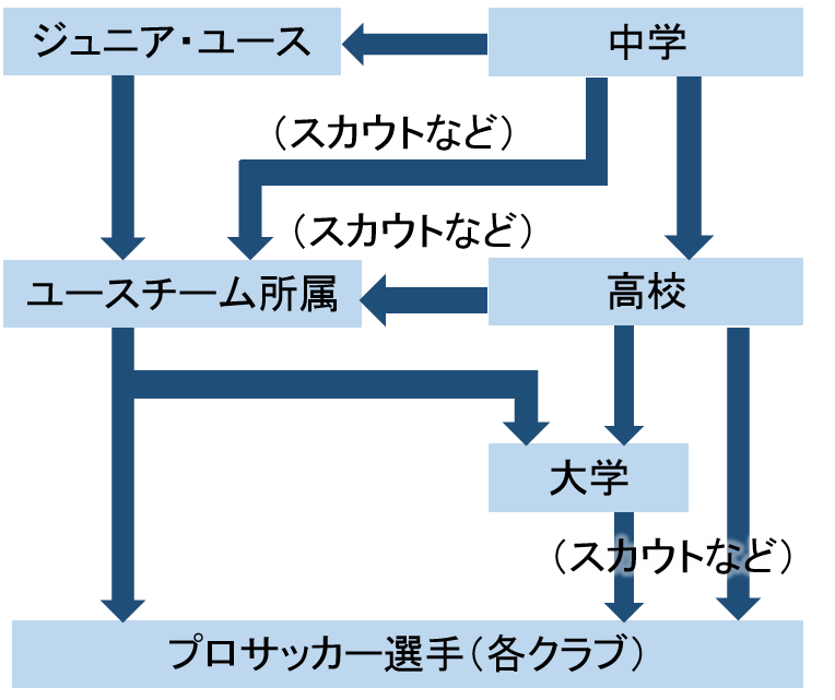 Jリーグのユースチーム(15~18歳が対象)からステップアップする方法や、中学・高校・大学・社会人などのチームで活やくしてスカウトされる方法、入団テストに合格する方法などがあります。